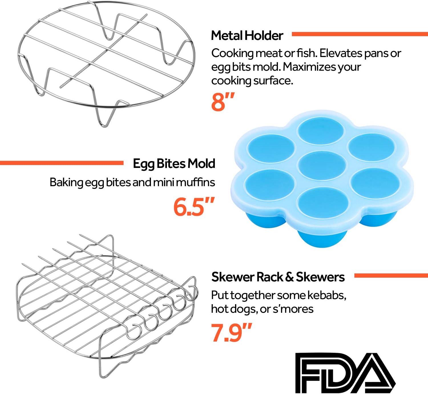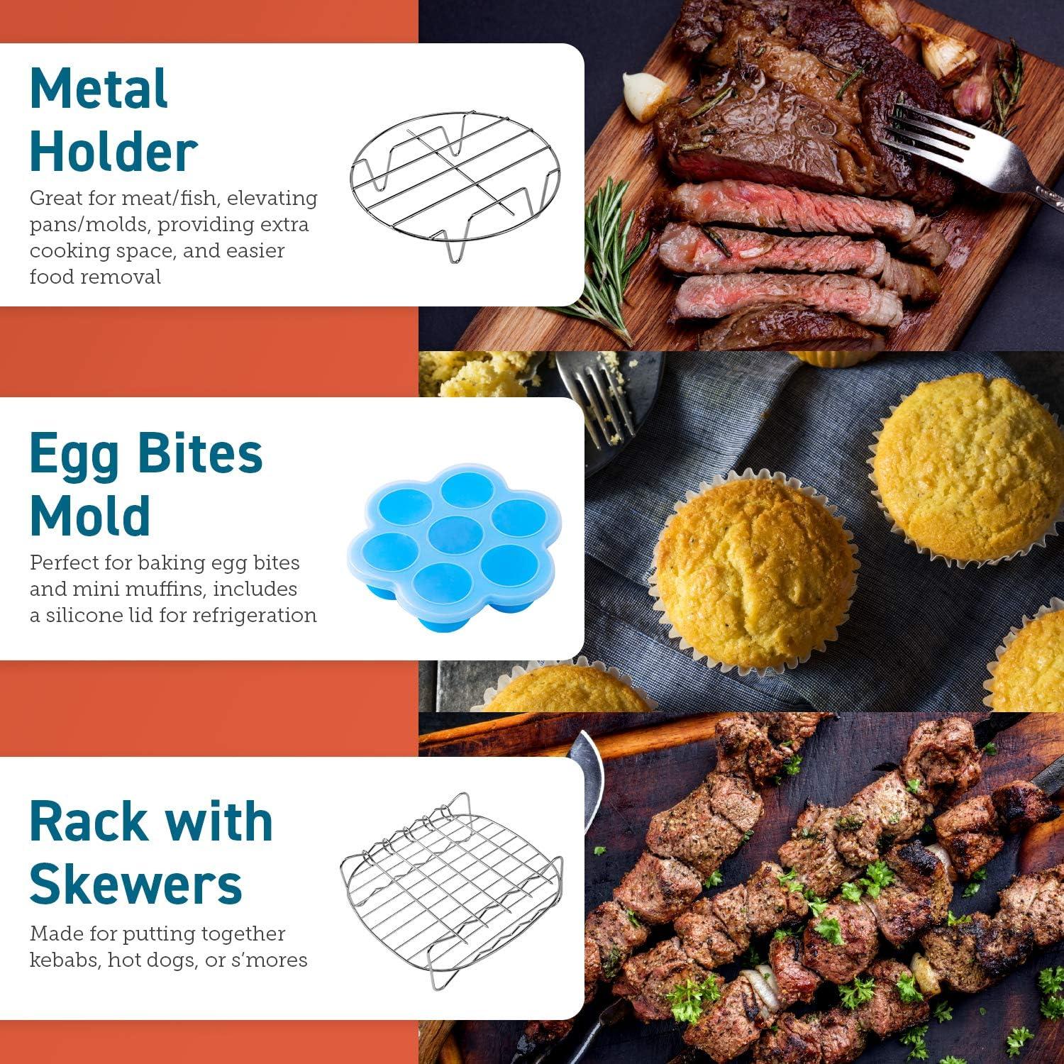 Enjoy Bonus Accessories – Cook cakes, pizzas, eggs, skewered foods, and more! Included accessories (Egg Bites Mold, Cake Pan, Pizza Pan, Metal Holder, Rack & Skewers, Silicone Mat) expand what you can make and even increase your cooking area in the air fryer