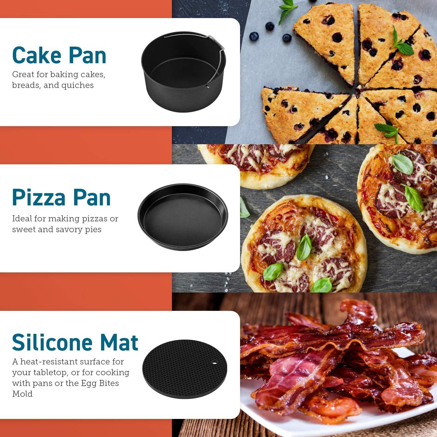 6 pcs accessory kit – Includes 1 x cake pan; 1 x pizza pan; 1 x metal holder; 1 x multi-purpose rack with 4 skewers; 1 x Silicone Mat; and 1 x egg bites mold with lid. Everything you need to cook without costing you more time and money to buy each piece individually