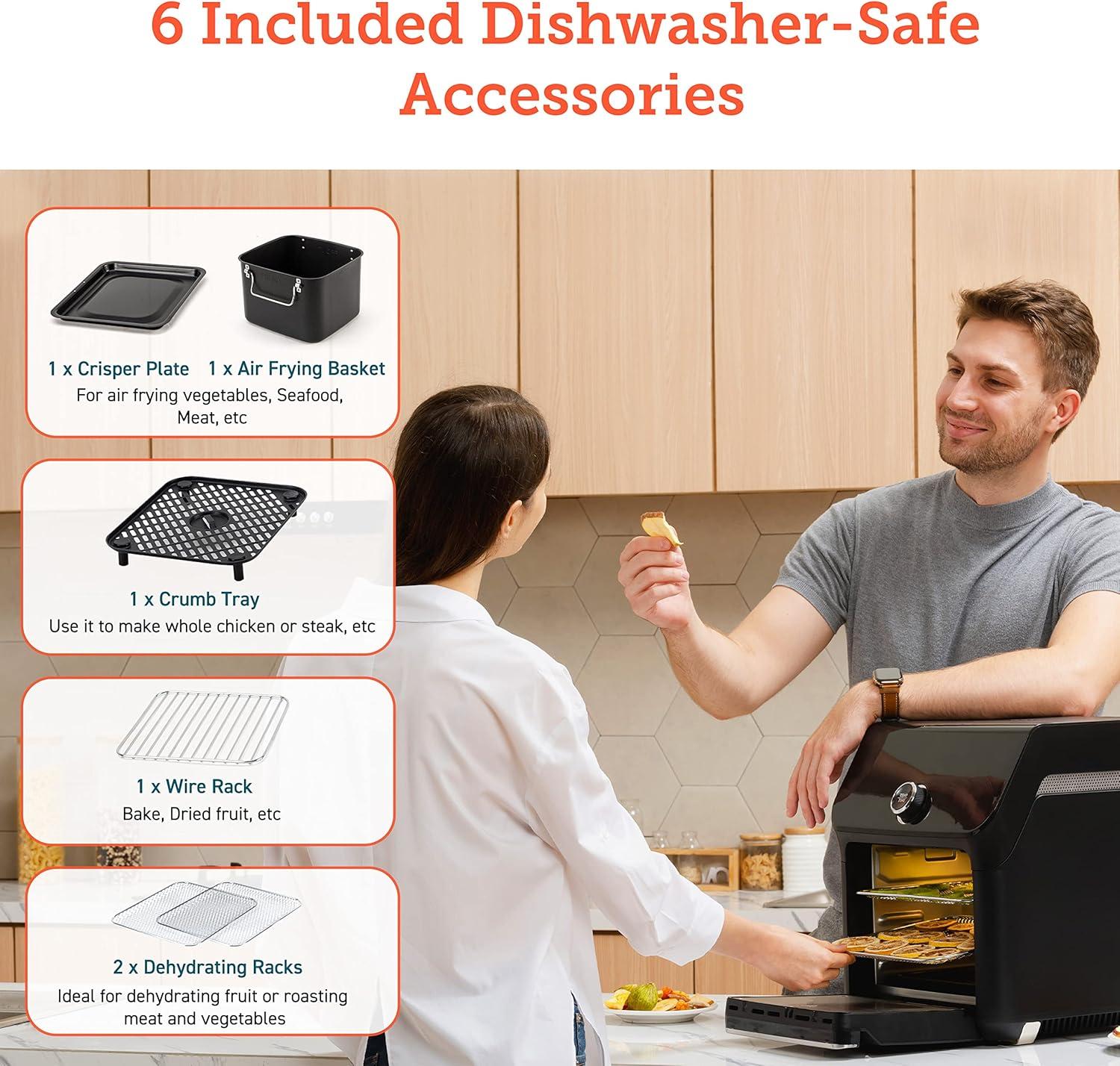 6 EXTRA ACCESSORIES: Make any meal you’re craving with an included air frying basket, wire rack, crumb tray, crisper plate, and 2 dehydrating racks