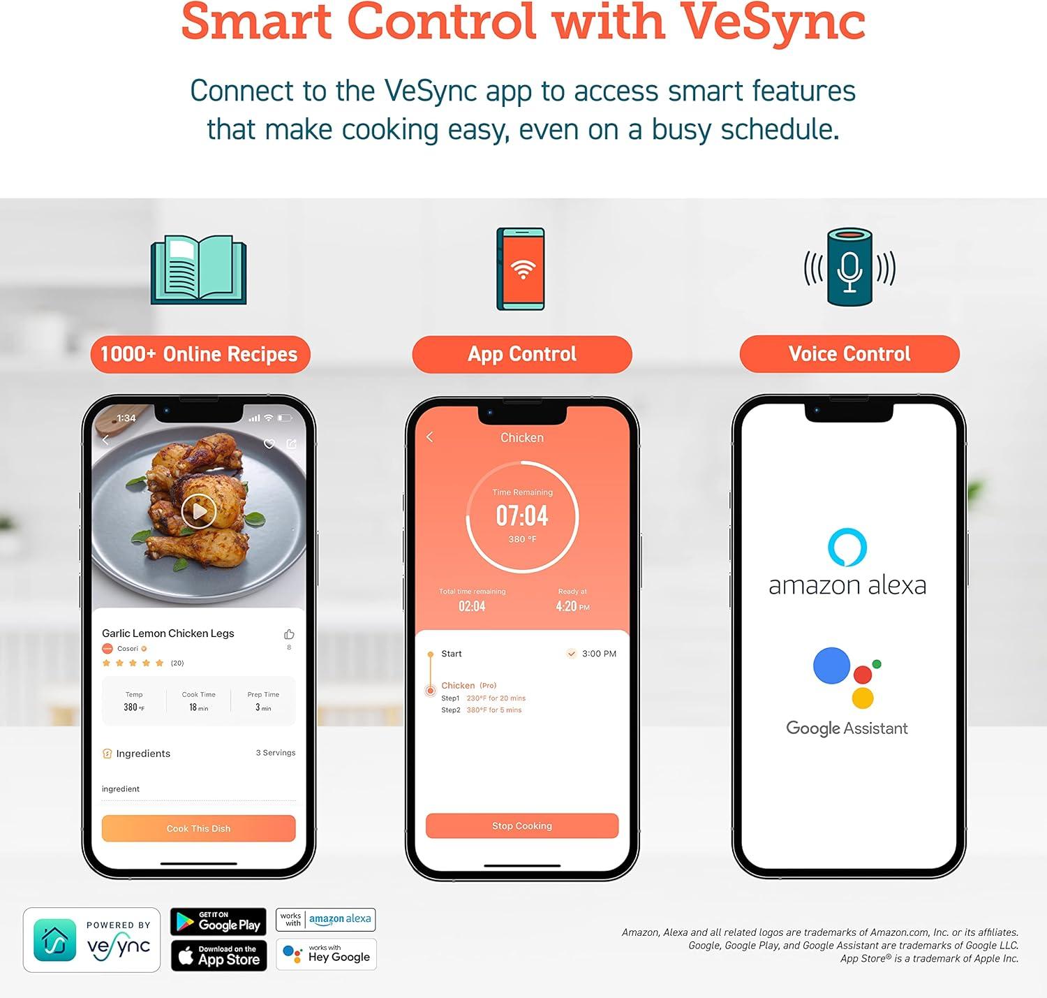 SMART CONTROL: Choose settings and monitor the cooking process remotely from your smartphone with the VeSync app, or access voice control through Amazon Alexa or Google Assistant