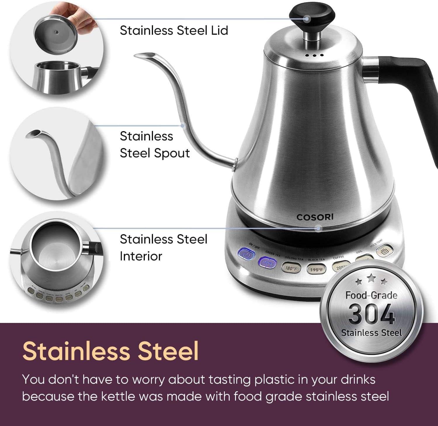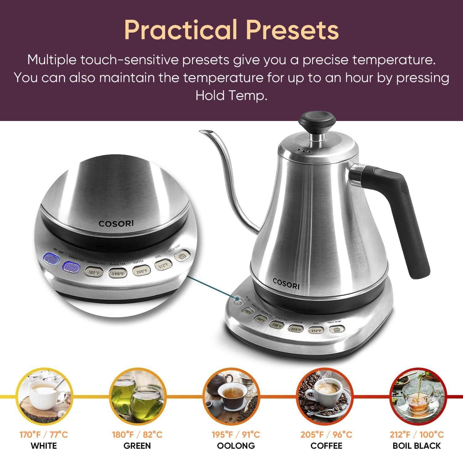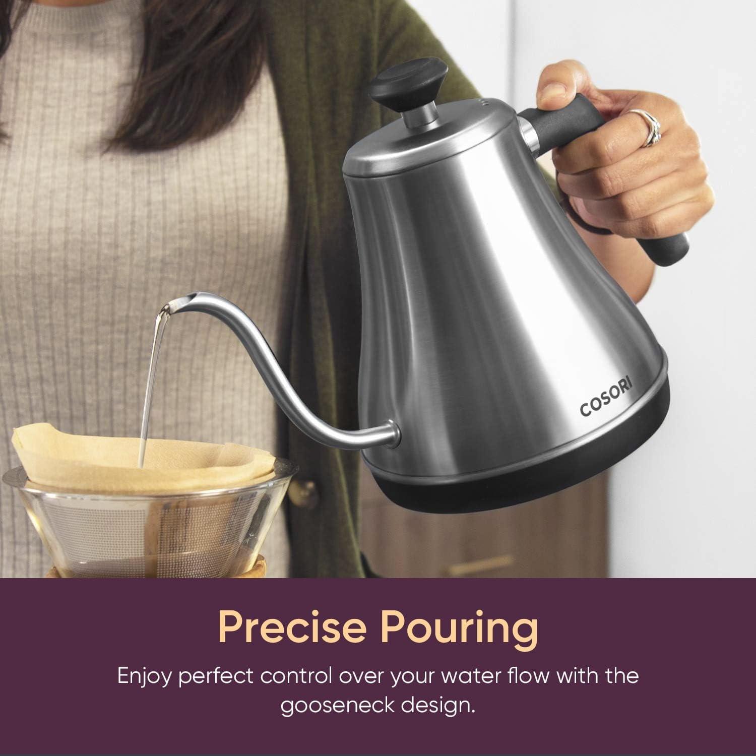 COSORI Electric Gooseneck Kettle with 5 Temperature Control Presets, Pour Over Kettle for Coffee & Tea, Hot Water Boiler, 100% Stainless Steel Inner Lid & Bottom, 1200W/0.8L(Silver)
