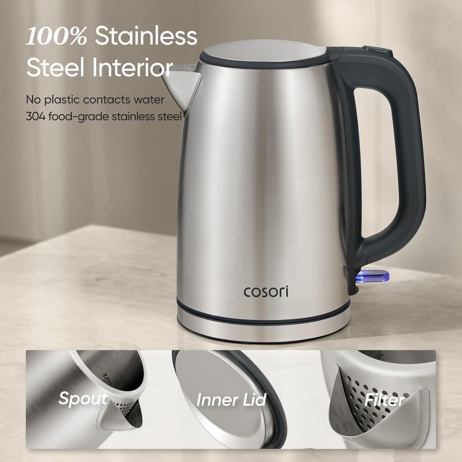 COSORI Electric Kettle, Stainless Steel Tea Kettle, Plastic-free Inner Lid, Filter and Spout, Easy to Clean, Automatic Shut Off & Boil-Dry Protection, Hot Water Boiler & Heater, 1.7L, 1500W(Stainless Steel)